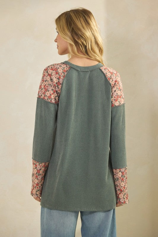 Ribbed Vintage Olive Floral Detail Top