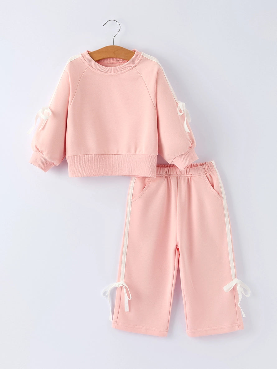 Girls Pink Bow Trim Sweatshirt & Pants Set