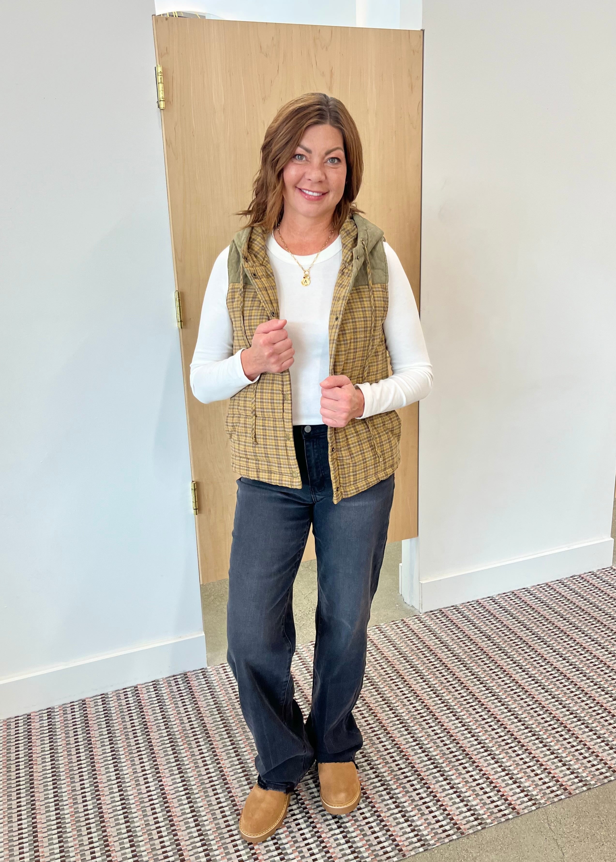 Mustard Mixed Plaid Puffer Vest