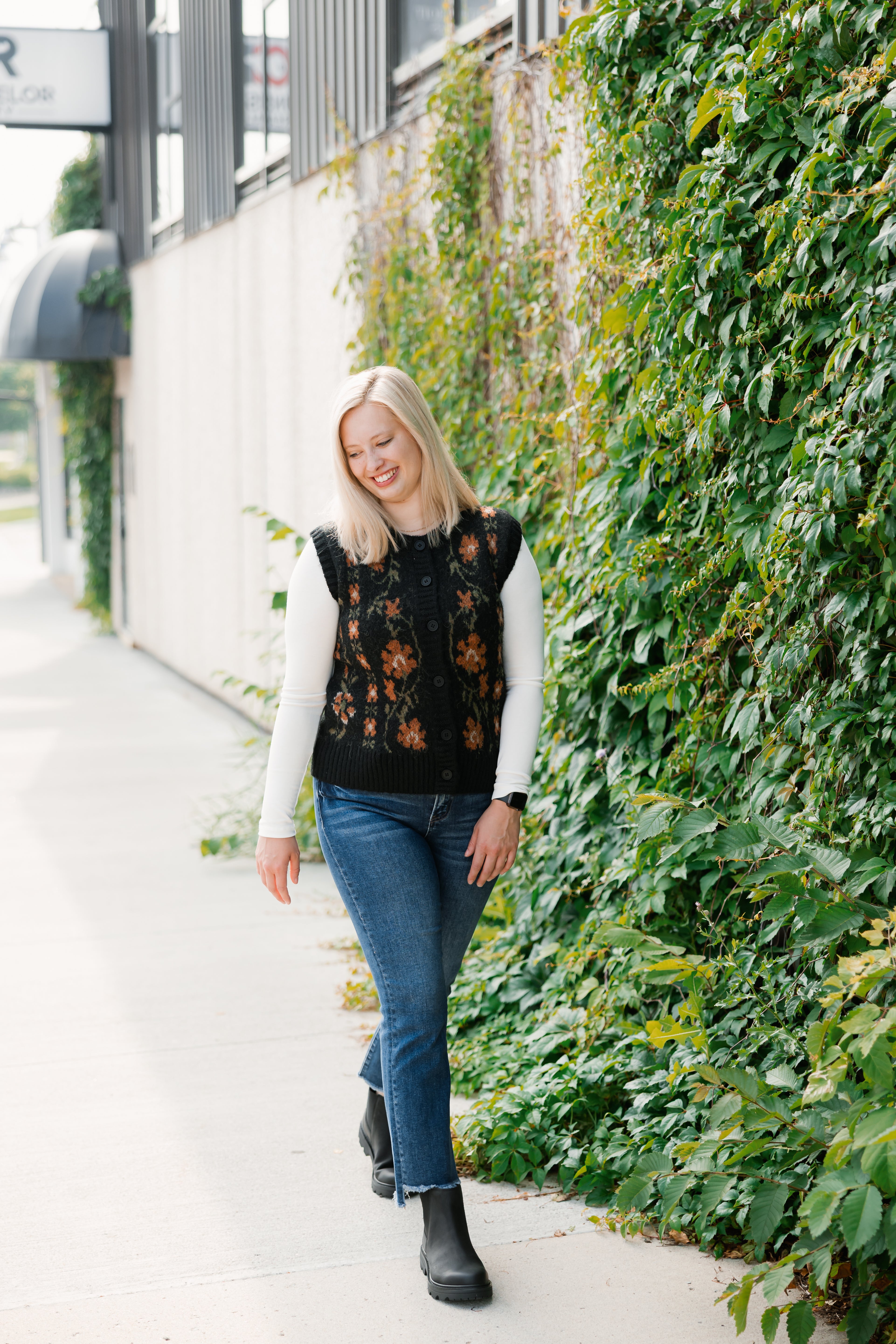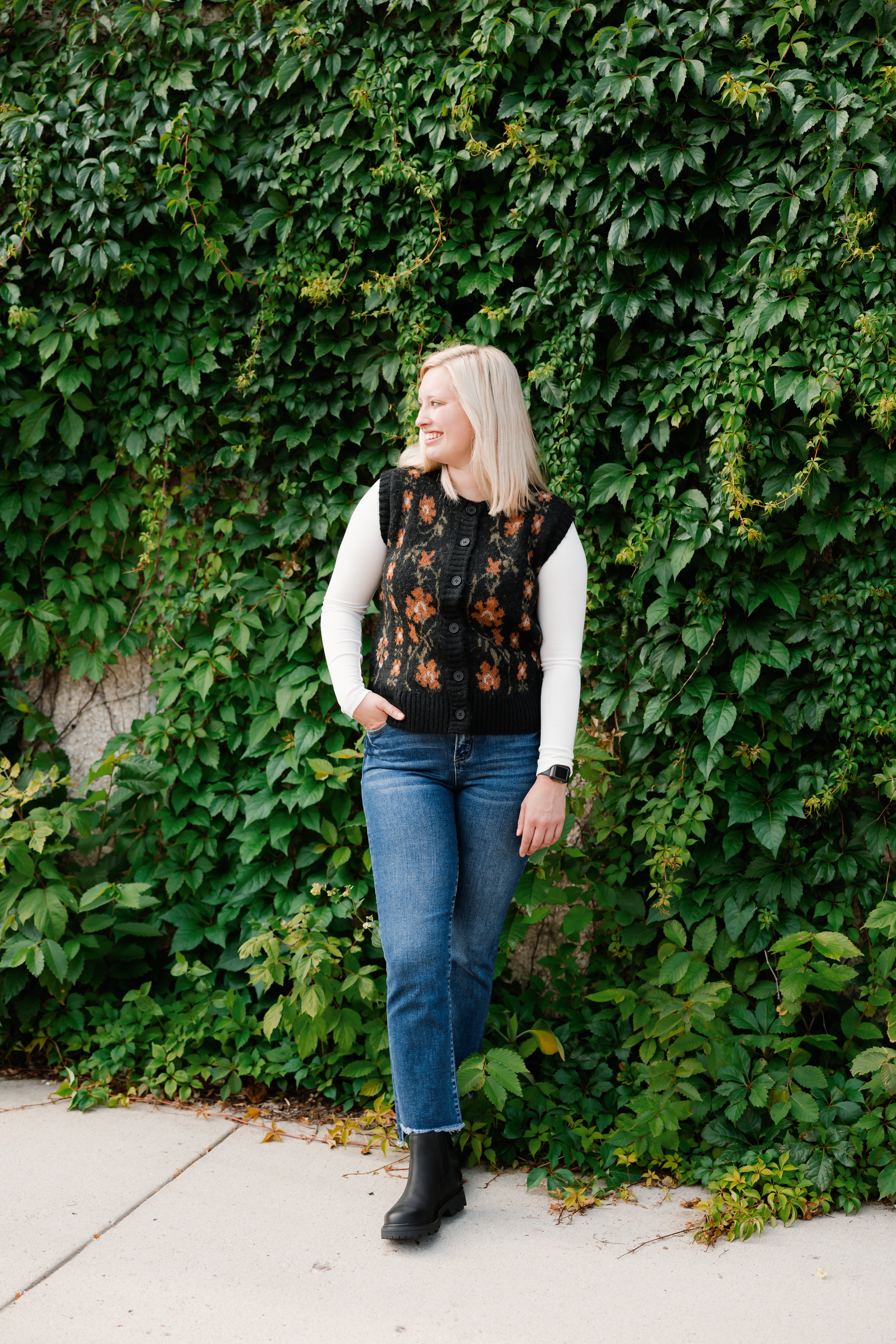 - We are loving this floral sweater vest layered with a long sleeve tee and jeans!