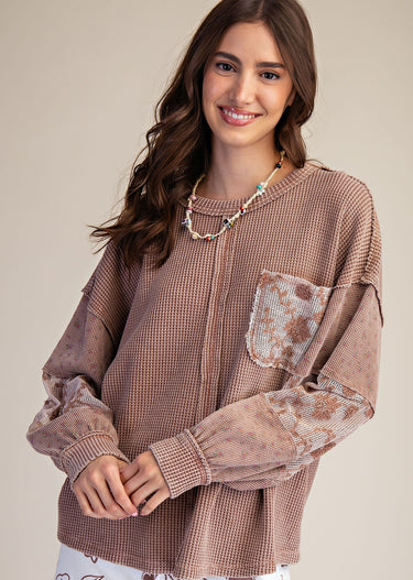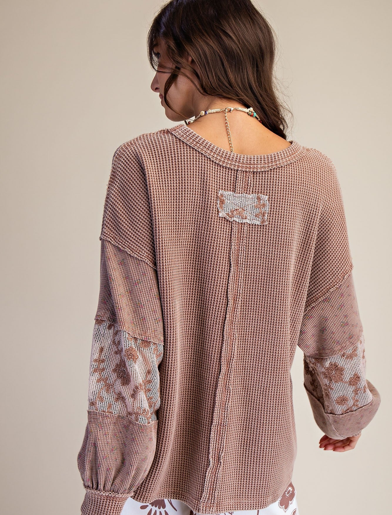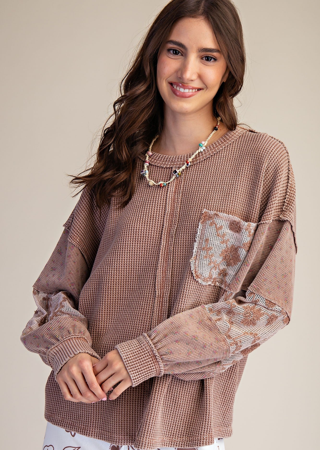 Easel Brand Mocha Waffle Embroidered Detail Top