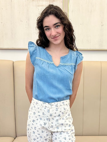 Washed Denim Embroidered Top